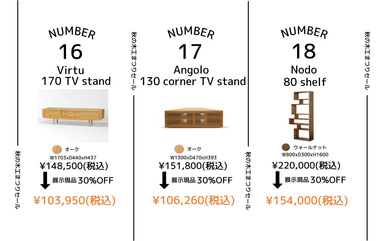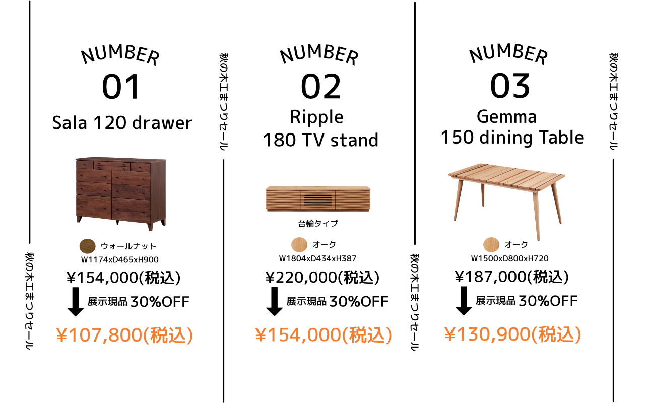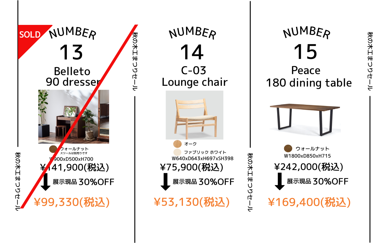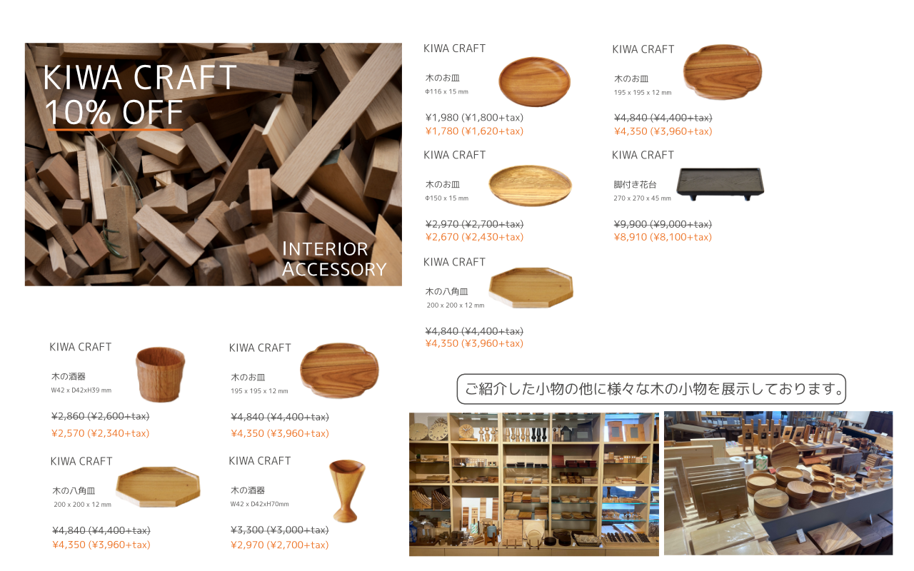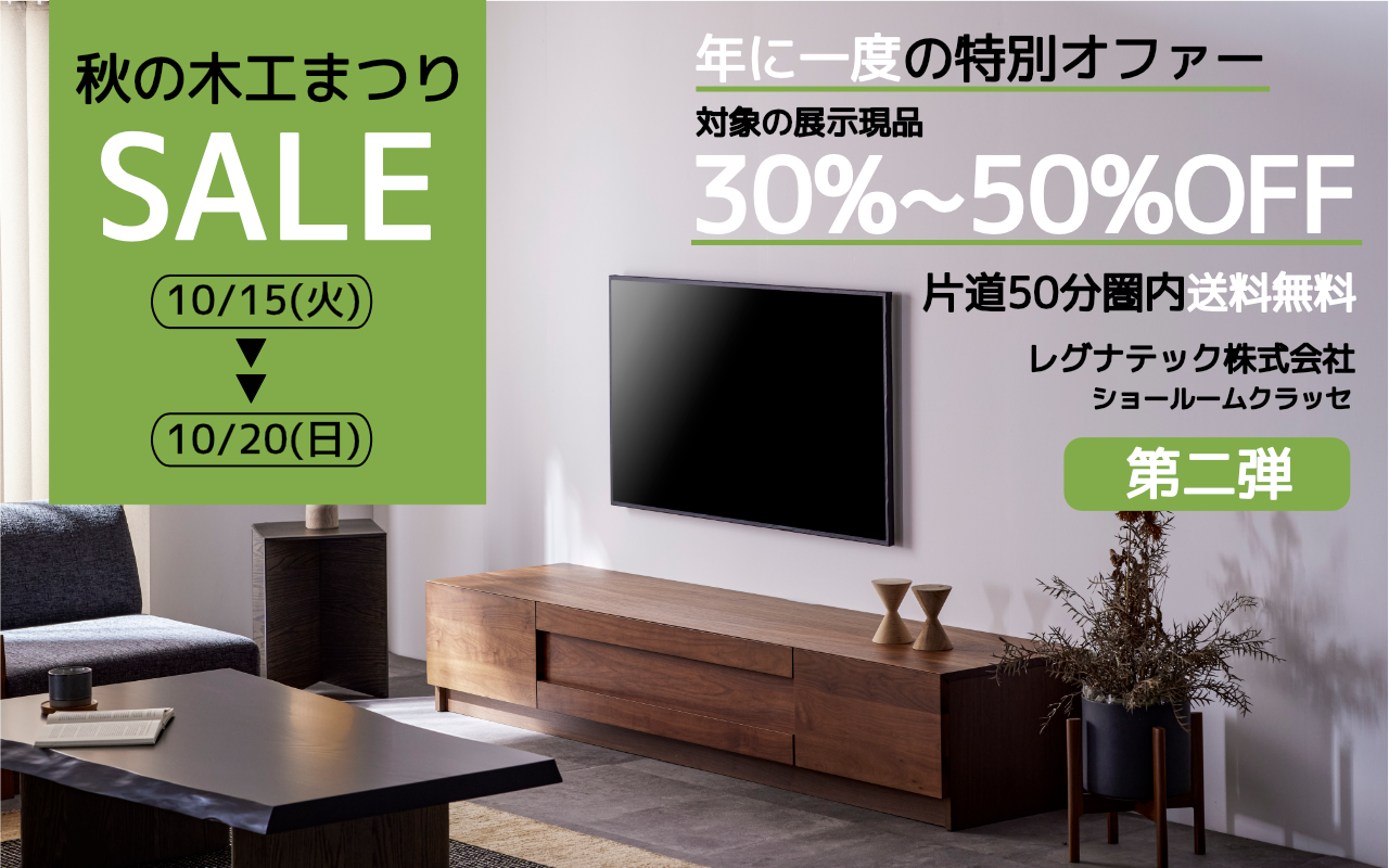 お得な現品販売だけでなく、クラッセ家具の在庫品・新規オーダー10%OFF。もちろん創作一枚板家具も10%OFF!
