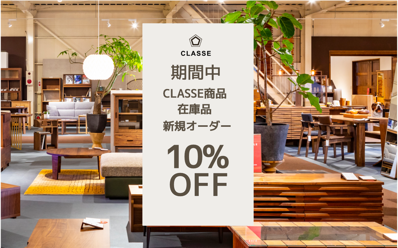 お得な現品販売ではなく、クラッセ家具の在庫品、新規オーダー10%OFF。