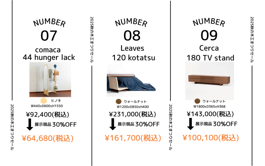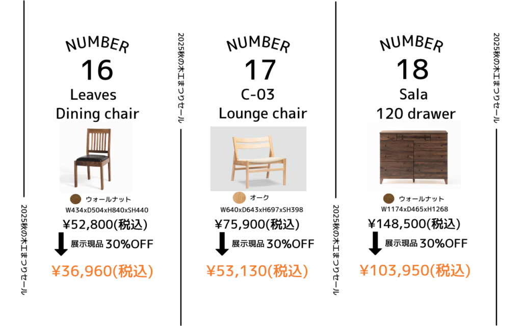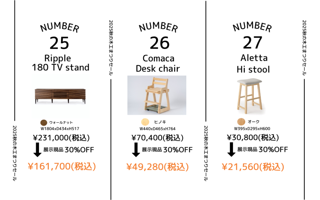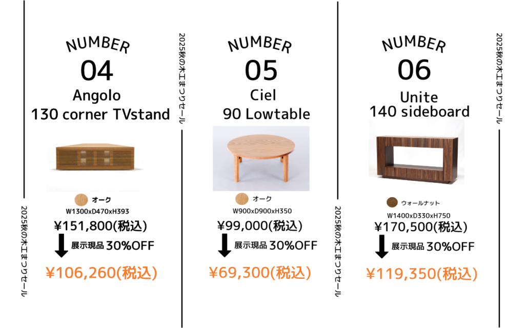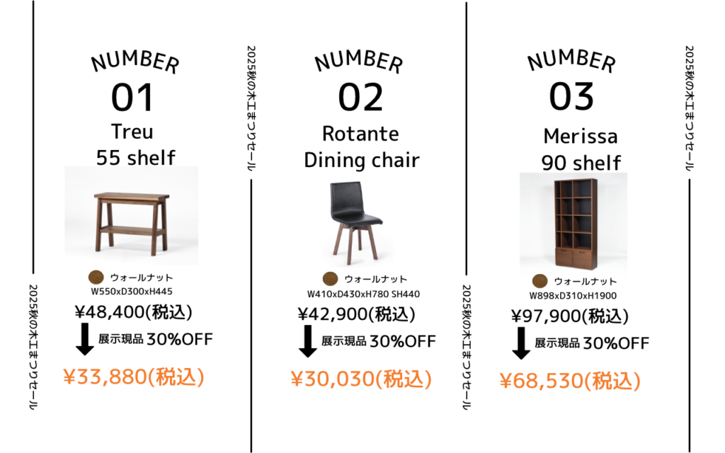 年に一度の秋の木工まつりセール、通常よりさらにお得な割引でご案内します。