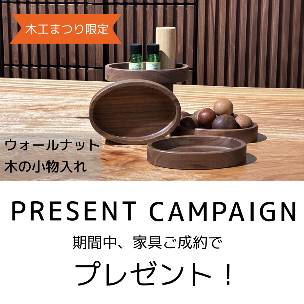 「家具をご成約のお客様にウォールナットの小物入れをプレゼント!」