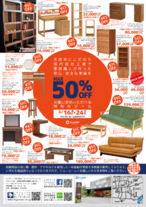 また、一枚板創作家具はALL10%OFF、CLASSE展示現品MAX50%oOFFにて。