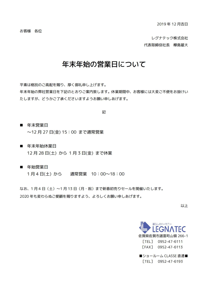 年末年始営業日のお知らせ[ショールーム CLASSE]