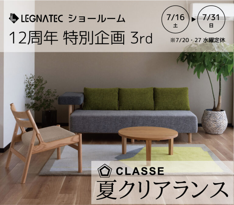 今月のショールームご来店限定企画は 夏のクリアランスセールを開催いたします。 CLASSE家具新規オーダー:10%off 〜 CLASSE展示入替対象品 :MA