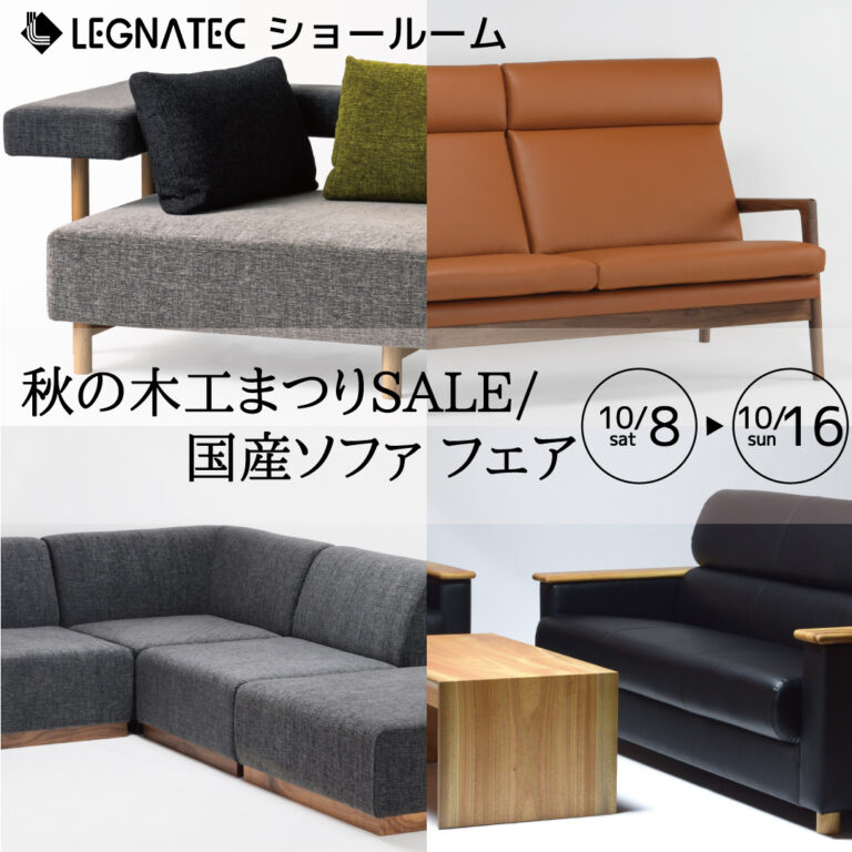 レグナテックショールームにて 秋の木工まつりSALEを開催いたします。 今回、数量限定のテーブル・スツールや、 展示品限りの国産ソファ 端材を活用したオリジナル